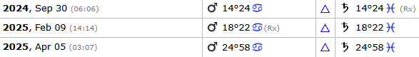 Poslednji put smo imali ovaj aspekt 30.septembra 2024. Mars u Raku, RSaturn u Ribama na 14°24'. Ovo je ponavljajući aspekt. Prvi je bio u septembru, drugi je ovaj u februaru i treći će se dogoditi 05.aprila